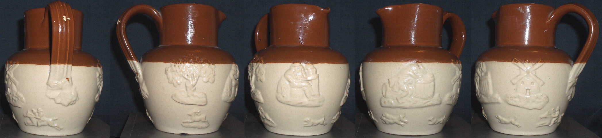 A distinguishing feature of Langley Mill jugs (marked Lovatts of Langley Mill) is a shoulder line of dots which Denby did not use and Doulton sprigs for the hunting scene on the lower section.