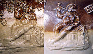Jug A shows topers identical to those of jug C, including the surrounding foliage (which is often varied) - and the identity extends to tiny plants impressed in the Smoker's base; jug B has a rare Thinker variant (on half-barrel); while “C” and “D” have exactly the same Toby. (Jug B has a slight variant differing only in its octagonal, piecrust table.) In another resemblance, Jug A has the tall windmill, and jug C what looks to be a shorter version of it (not illustrated by other writers.)