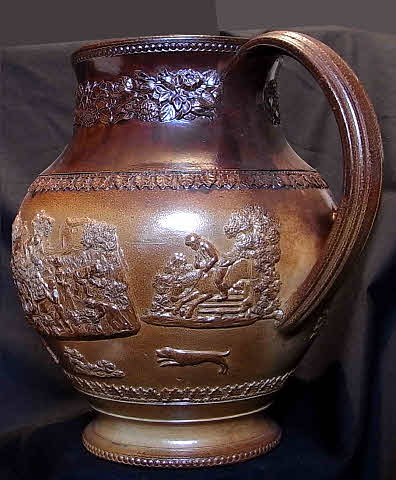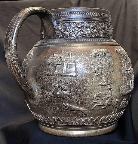 This 12 pint jug has many finely detailed sprigs and a variant of the three men sprig (two are wearing hats). It is also likely to be from the Caledonian Pottery