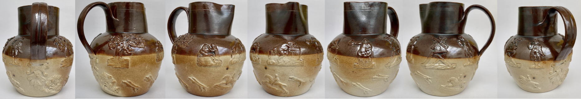 5 pint and 4 pint jugs. Many of these sprigs appear identical to ones found on jugs that can be ascribed to Bourne of Denby. These include the huntsman, fox in covert and windmill.