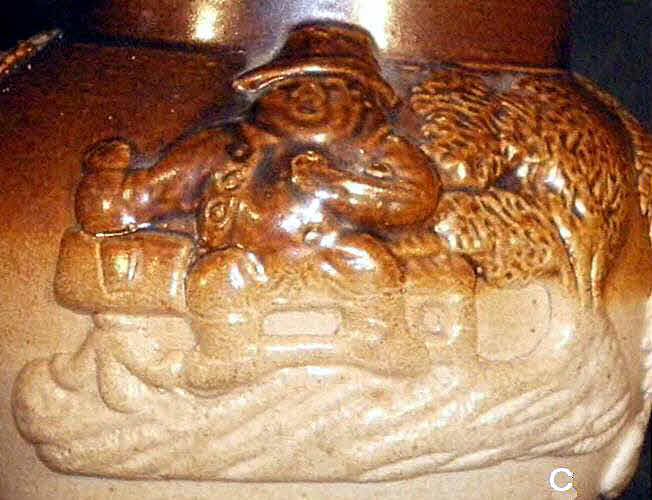 I am now convinced that all three variants are from Mortlake. No Kishere marked mustards have been recorded and the not uncommon Unidentified 3 nicely fills the 1820s to 1840s gap (some earlier mustards can be identified as Mortlake, being miniature versions of regular Mortlake jugs). Variant 3 must be the last as the Kishere Pottery closed around 1843 but it is unclear which of variants 1 and 2 came first assuming they were not both in use at the same time. See below for an album of examples using sprig Unidentified 3. The Kishere sprig moulds may have been acquired by James Stiff who started his own pottery around 1842, and see below for two examples with the same variant 3 sprig.
