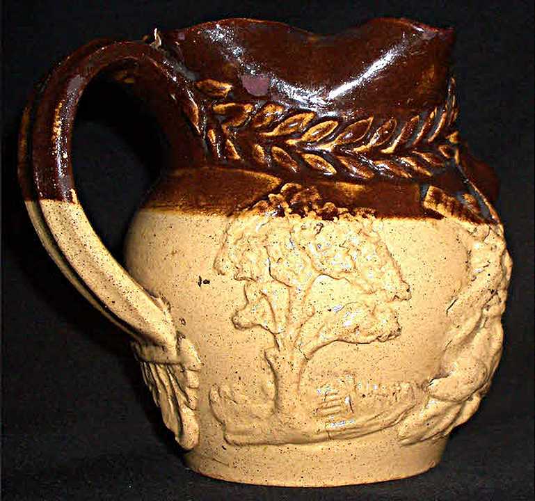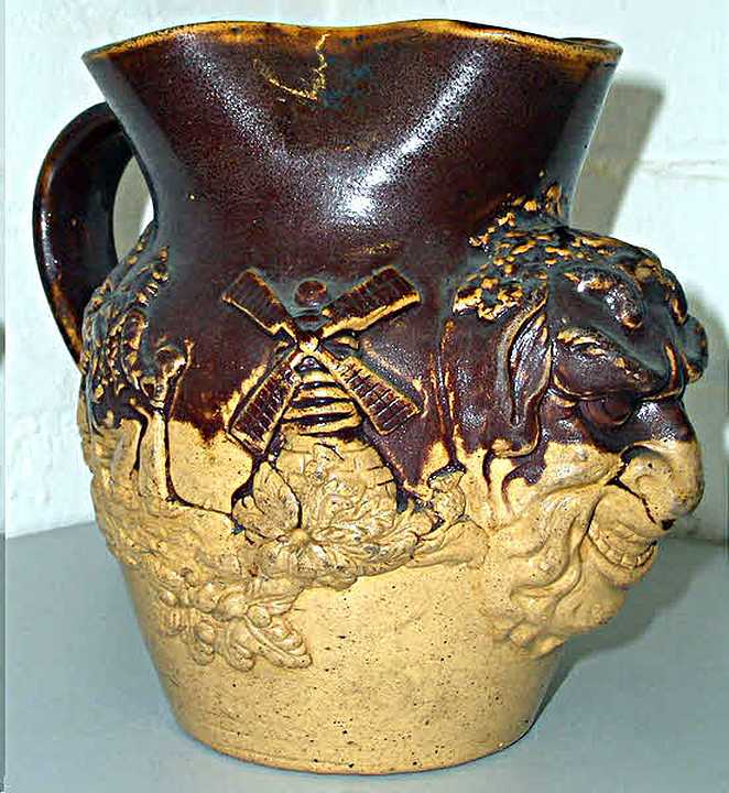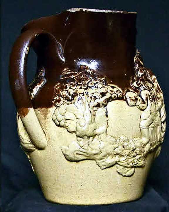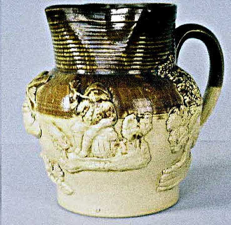 A series of sprigged lead glazed? earthenware? jugs with large grotesque faces. The body might suggest Bristol or even Staffordshire but the sprigs are much closer to those on Derbyshire (Brampton/Chesterfield) salt glazed wares.