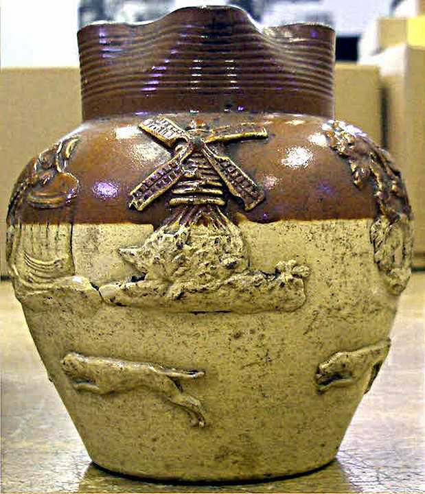 We associate the Briddons with high quality (often signed) honey coloured salt glaze but they also made bricks (Freebody's Directory 1852) and a lead glazed earthenware copy of the well known monkey jug (made in stoneware in both Staffordshire and Denby) is known with a label indicating manufacture (1850) at the Walton pottery, which is presumed to be that of William Briddon.
