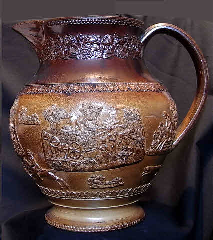 This 12 pint jug has many finely detailed sprigs and a variant of the three men sprig (two are wearing hats). It is also likely to be from the Caledonian Pottery