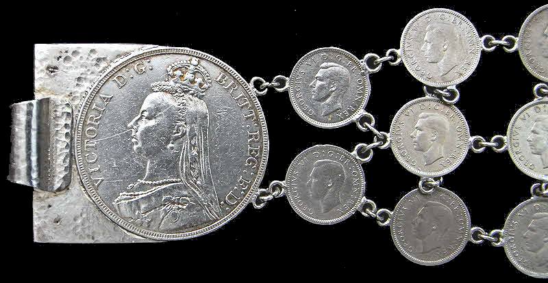 This belt would seem to be, at first glance, from the UK. It is composed of 67 silver threepenny pieces of King George VI. The heavy silver clasps incorporate two 1887 Queen Victoria Silver Jubilee Crowns. However the dates of many of the three penny coins (1942, 1943, 1944) indicate that the origin of this belt is not the UK, as coins of these dates were all sent to the Caribbean.