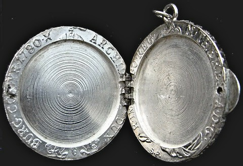 Clearly no longer used as a coin, this Maria Theresa restruck Thaler is designed as a pendant. This seems a suitable place to contain, and protect, an image of a loved one.