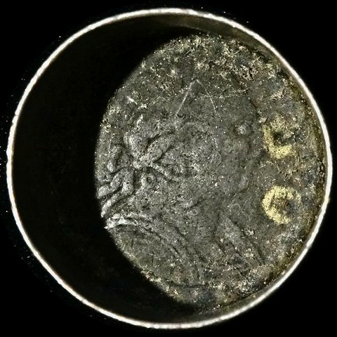 This box with an earlier copper halfpenny of George II, cc 1770-1775, probably utilises a cast copy of a genuine coin.