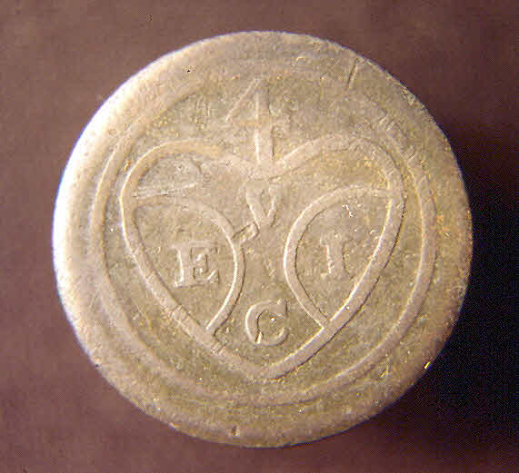 Java tin doits, obverse left; reverse right. These doits were only struck in 1813 and 1814 by the Dutch mint master Ekenholm, using the United East India Company balemark. Lead forgeries are known.