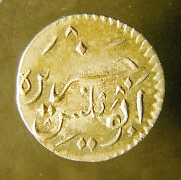A separate mint for gold and silver was erected at Sourabaya and silver rupees were struck from 1813 to 1816. The obverse on the left is in Javanese with Zwekkert’s initial below. The reverse on the right is in Arabic script; there is an engraving mistake in the date (mid left side). It reads 1668, instead of 1228; mistakes were common when European engravers reproduced Arabic and other unfamiliar languages.